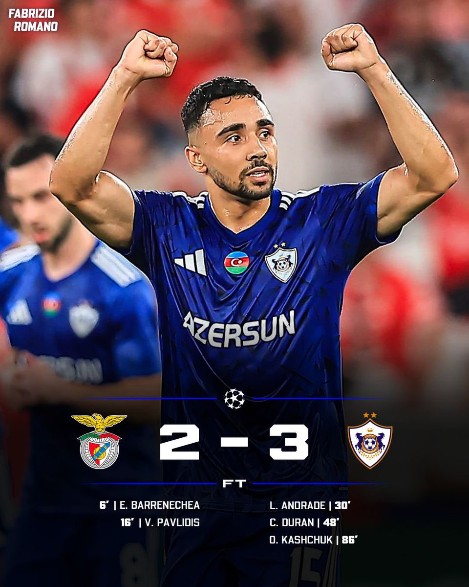 Azerbaijan’s FK Qarabag made history with a 3-2 comeback win over Benfica in Lisbon. This was their first-ever Champions League victory and a huge upset in European football.