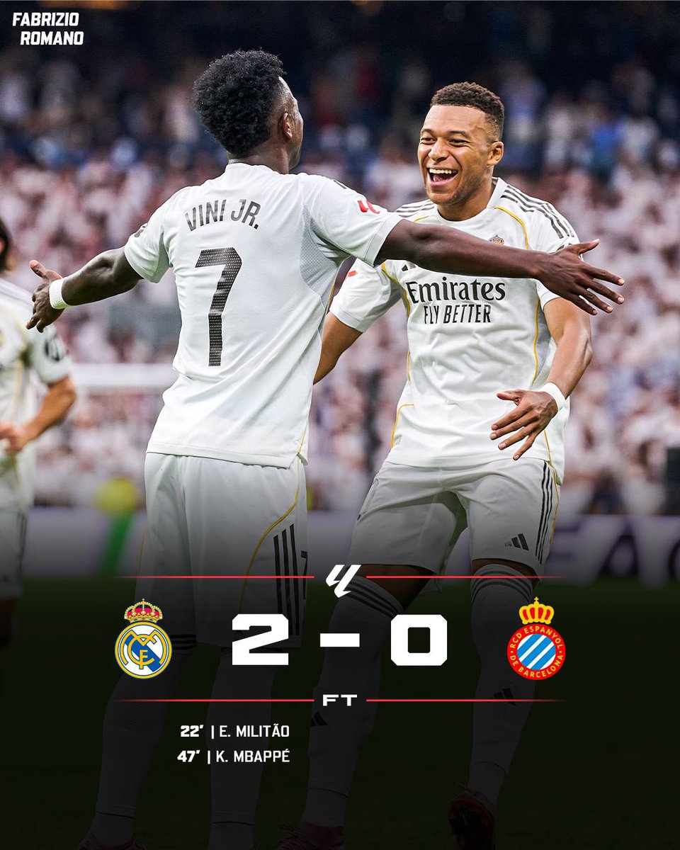 Dean Huijsen missed the game due to suspension, with Raul Asencio stepping in at centre-back. Real Madrid controlled Espanyol, grabbing the three points and staying at the summit of La Liga. Espanyol had started the day third but failed to break Madrid’s defense.