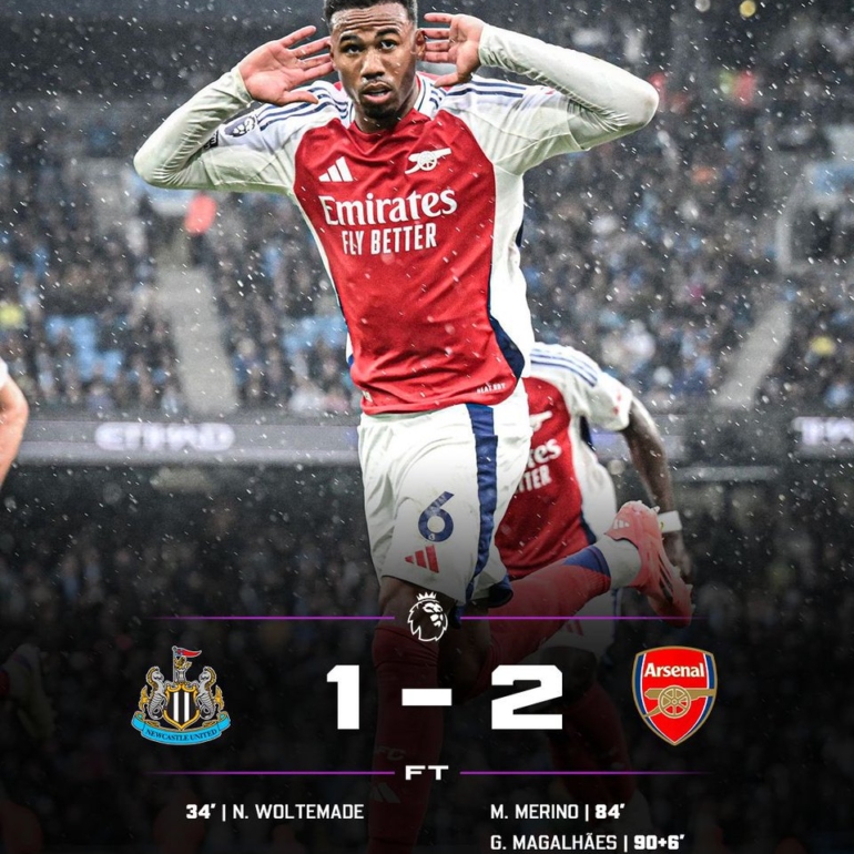 Arsenal won 2-1 against Newcastle United at St. James' Park, scoring a dramatic goal in the 96th minute. This victory takes Arsenal to second place in the Premier League, keeping them close to leaders Liverpool.